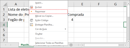 | Clique com o botão direito na guia Plan1. O menu flutuante com a opção Renomear será habilitado.Clique na opção Renomear, digite Lista_Produtos e pressione a tecla ENTER. | ![]() |